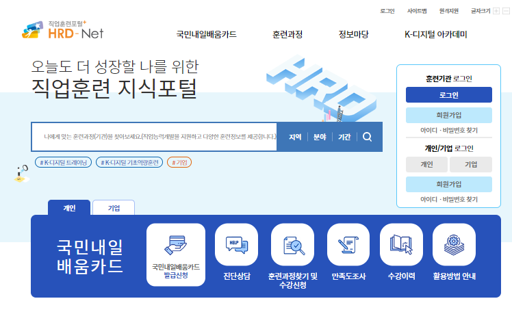 직업훈련포털 HRD-Net 내일 배움 카드제, 근로자직무능력향상훈련, 기업체 지원훈련, 일학습병행, 전국 훈련기관