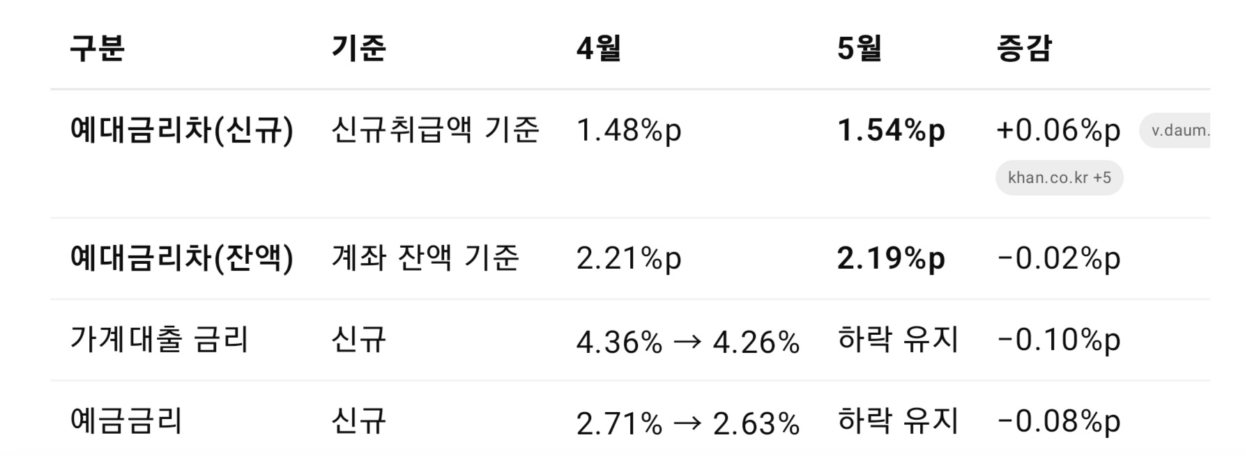 5월 기준 2.19%포인트로 4월(2.21%)보다